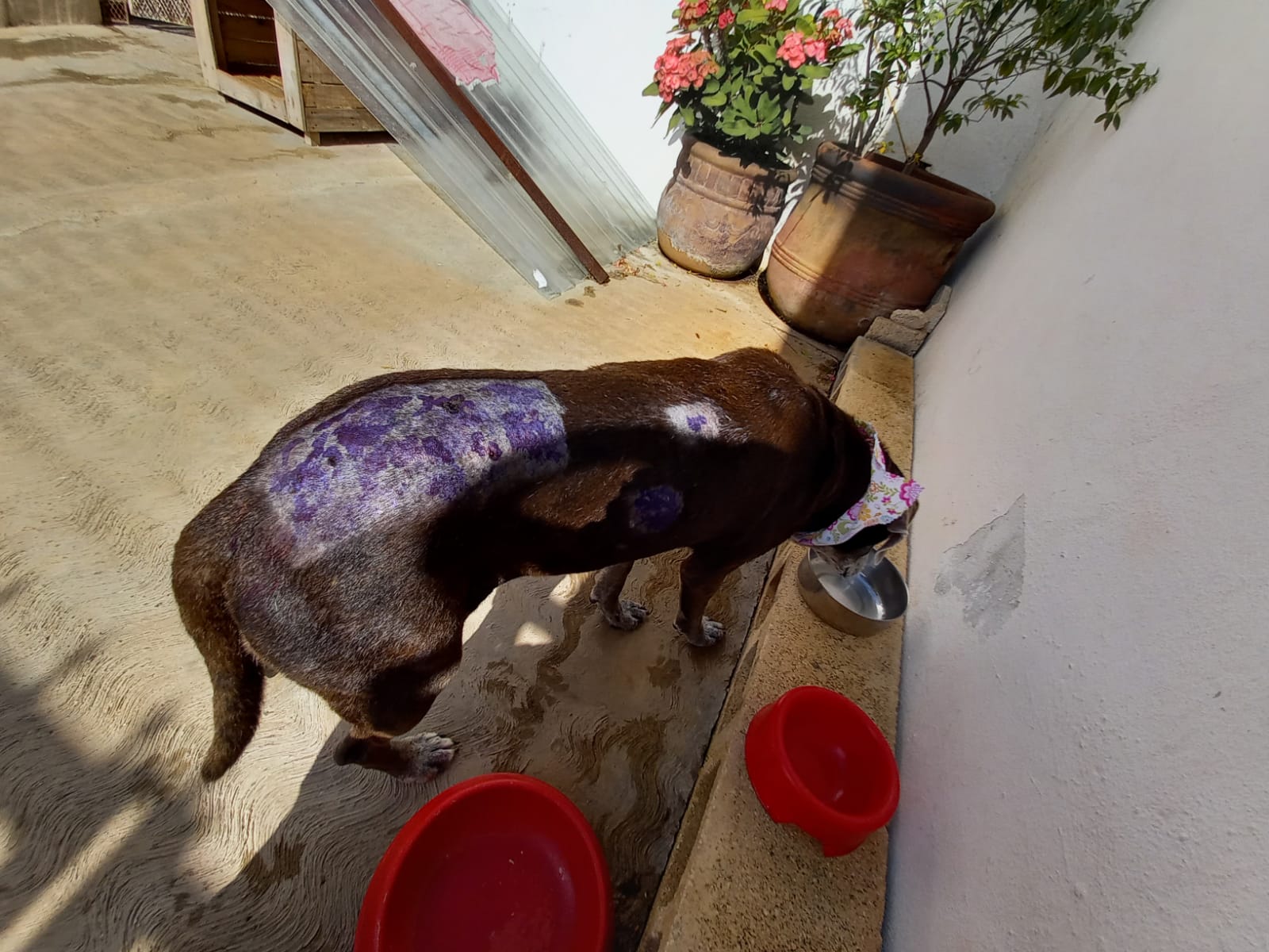 Once we were able to gain her trust by offering food and fresh water, we got Gracie into our jeep and immediately took her to the vet. She was cleaned, bathed and all wounds treated. We conducted  TVT test and removed her ticks. We placed her in a temporary foster home, where she starting to recuperate from her wounds.